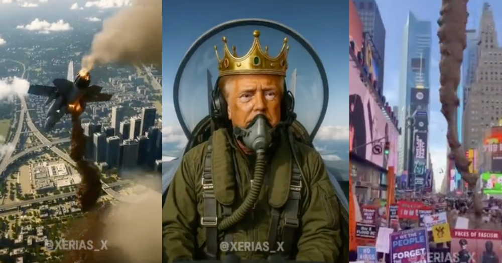 သမ္မတ Donald Trump က စနေနေ့မှာ သူတိုက်လေယာဉ်တစ်စီးပေါ်ကနေ အမေရိကန် ဆန္ဒပြသူတွေအပေါ် မစင်လို့ ယူဆရတဲ့အရာတွေ ကြဲချနေပုံဖော်ထားတဲ့ AI ဗီဒီယိုတစ်ခုကို ပို့စ်တင်ခဲ့ပါတယ်။