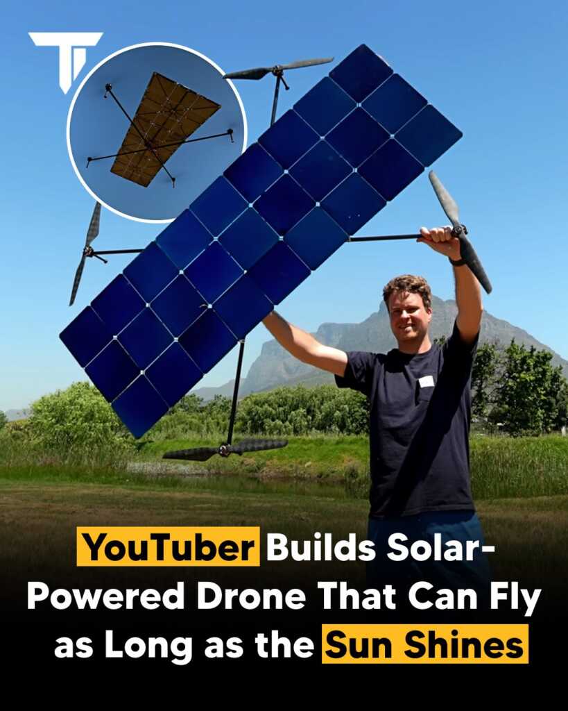 YouTuber တစ်ဦးဖြစ်တဲ့ Luke Máximo Bell ဟာ နေရောင်ခြည်စွမ်းအင်တစ်ခုတည်းနဲ့ လုံးဝမောင်းနှင်နိုင်တဲ့ ရှေ့ပြေးပုံစံ ဒရုန်းတစ်စင်းကို ဖန်တီးလိုက်ပါတယ်။ ဒါဟာ ရေရှည်တည်တံ့တဲ့ နေရောင်ခြည်စွမ်းအင်ကို အသုံးပြုထားပါတယ်။